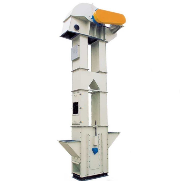 ne斗式提升機(jī)將固定殼體插入活動(dòng)體內(nèi)并通過(guò)螺栓連接安裝在支架上;同時(shí)在固定殼體與活動(dòng)體之間壓上厚發(fā)泡橡膠,起到緊貼密封作用;改向滾筒、從動(dòng)軸和軸承座固定在活動(dòng)體上。調(diào)節(jié)時(shí)由液壓缸帶動(dòng)活動(dòng)體,活動(dòng)體通過(guò)軸承座帶動(dòng)改向滾筒和從動(dòng)軸繼而調(diào)整鏈條或備斗帶的張緊力。由于軸承座是在活動(dòng)體上固定的,沒(méi)有開(kāi)長(zhǎng)孔,所以就避免了在運(yùn)行過(guò)程中冒灰。在活動(dòng)體底部設(shè)有一對(duì)對(duì)開(kāi)弧形清掃門(mén)。當(dāng)發(fā)生堵料或停機(jī)檢修時(shí)打開(kāi)弧形清理門(mén),物料自行下落,及時(shí)清理殼體內(nèi)的積料,避免了物料長(zhǎng)期堆積腐爛變質(zhì)影響物料質(zhì)量和腐蝕提升機(jī)殼體,同時(shí)減輕工人勞動(dòng)強(qiáng)度,提升工作效率。