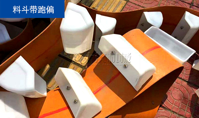 解決方法:料斗帶跑偏,易引起料斗與機(jī)筒的撞擊、料斗帶的撕裂。應(yīng)立即停機(jī),排除故障。做到頭輪和底輪的傳動(dòng)軸安裝在同一垂直平面內(nèi),而且都在水平位置上,整機(jī)中心線在1000mm高度上垂直偏差不超過2mm,積累偏差不超過8mm。