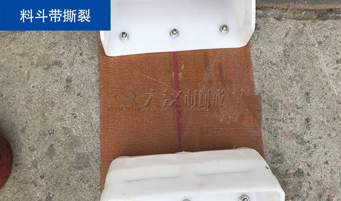 提升機(jī)料斗帶通常為帆布帶,有時(shí)也采用膠帶和鏈條。在各種故障的綜合作用下,帆布帶和膠帶容易產(chǎn)生撕裂,這是嚴(yán)重的故障之一。一般料斗帶跑偏和料斗的脫落過程容易引起料斗的撕裂。應(yīng)及時(shí)全面的查清原因,排除故障。另外,物料中混入帶尖棱的異物,也會(huì)將料斗帶劃裂。