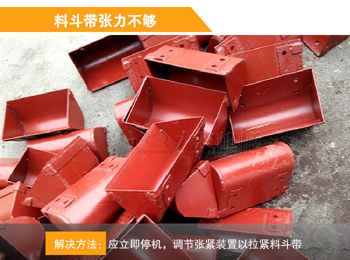 解決方法:應(yīng)立即停機(jī),調(diào)節(jié)張緊裝置以拉緊料斗帶。若張緊裝置不能使料斗帶完全張緊,說(shuō)明張緊裝置的行程太短,應(yīng)重新調(diào)節(jié)。正確的解決方法是解開(kāi)料斗帶接頭,使底輪上的張緊裝置調(diào)至位置,將料斗帶由提升機(jī)機(jī)頭放入,穿過(guò)頭輪和底輪,并首尾連接好,使料斗帶處于將張緊而未張緊的狀態(tài)。然后使張緊裝置完全張緊。此時(shí)張緊裝置的調(diào)節(jié)螺桿尚未利用的張緊行程不應(yīng)小于全行程的50%。