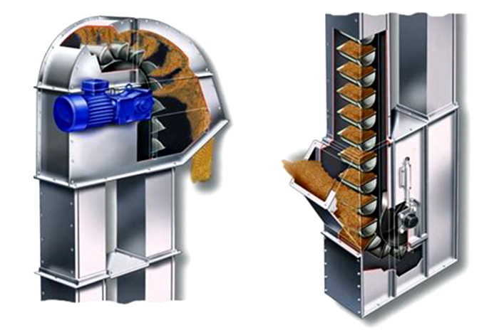 不銹鋼斗式提升機電機轉動聯軸器、頭輪和畚斗帶運轉,裝在畚斗帶上的畚斗將物料從提升機底部提升到所需的高度。