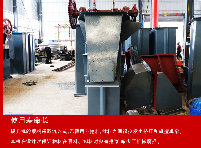 4.使用壽命長;提升機(jī)的喂料采取流入式,無需用斗挖料,材料之間很少發(fā)生擠壓和碰撞現(xiàn)象。本機(jī)在設(shè)計時保證物料在喂料、卸料時少有撒落,減少了機(jī)械磨損。