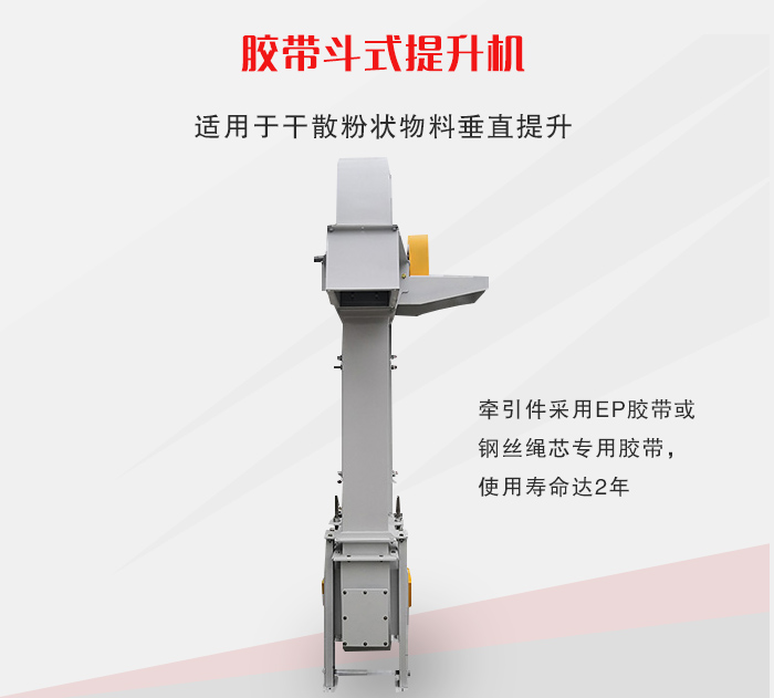 1.提升范圍廣。膠帶斗式提升機(jī)可提升各種粉狀、粒狀和塊狀(≤30mm)物料,物料溫度≤120℃.