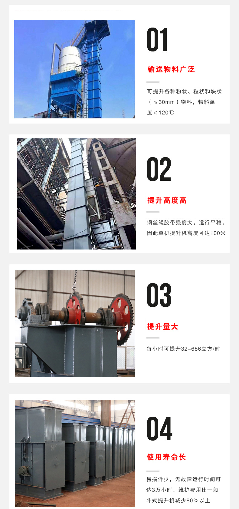 3.提升能力大。膠帶斗式提升機(jī)可提升32-686m3/h 。