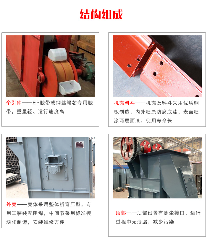 斗式提升機(jī)由上部區(qū)段、中部機(jī)殼、下部區(qū)段、帶料斗的輸送帶等牽引部件、傳動裝置和室外檢修平臺組成。