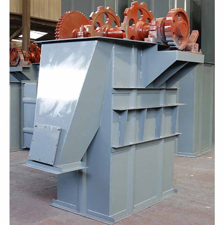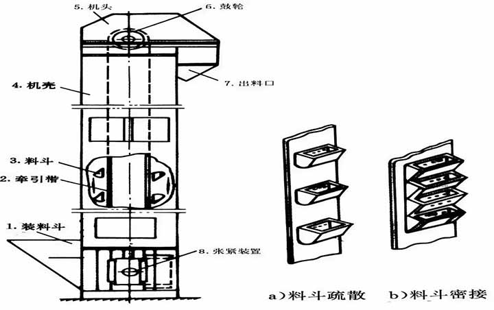 斗式提升機(jī)由上部區(qū)段、中部機(jī)殼、下部區(qū)段、帶料斗的輸送帶等牽引部件、傳動(dòng)裝置和室外檢修平臺(tái)組成。